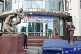 Сегодня в Махачкале состоялось открытие памятника выдающемуся борцу вольного стиля Али Алиеву, торжественная церемония прошла у здания республиканского министерства по физической культуре и спорту, где и установлен памятник.