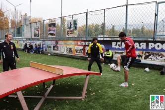 В Махачкале на поле РДЮСШ (школа Маркарова) состоялся турнир по текболу. Игра напоминает настольный теннис. Используется искривленный стол и мяч, похожий на футбольный, ударять по которому можно любой частью тела, кроме рук.