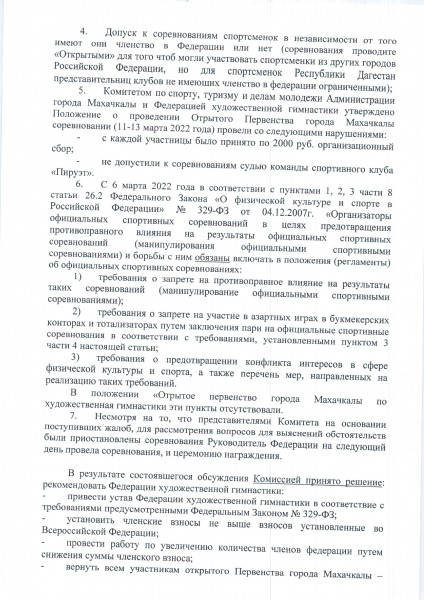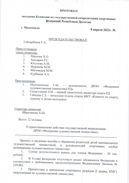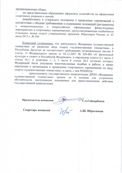 Приказ Министерства по физической культуре и спорту Республики Дагестан о приостановлении аккредитации ДРОО «Федерация художественной гимнастки».