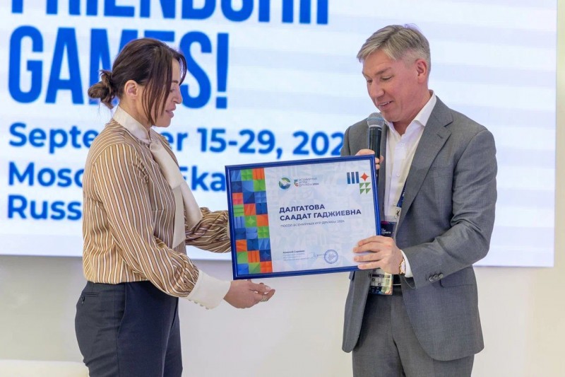 Сертификат посла и именную куртку с символикой Всемирных Игр дружбы Саадат Далгатовой вручил генеральный директор оргкомитета Игр Алексей Сорокин в Казани, где проходят Игры будущего – первый международный мультиспортивный турнир в концепции фиджитал.