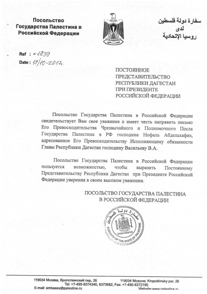Благодарственное письмо на имя врио Главы Дагестана Владимира Васильева поступило от посла Палестины в Российской Федерации Абдель Хафеза Нофаля. В письме выражается благодарность за участие дагестанского ансамбля «Лезгинка» в Днях российской культуры в Палестине.